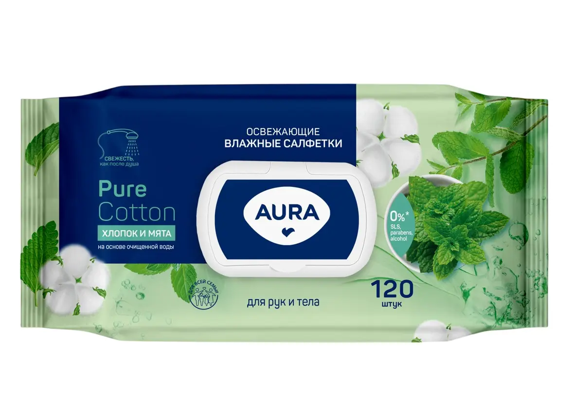 Aura Family влажные салфетки освежающие big pack с крышкой 120 шт