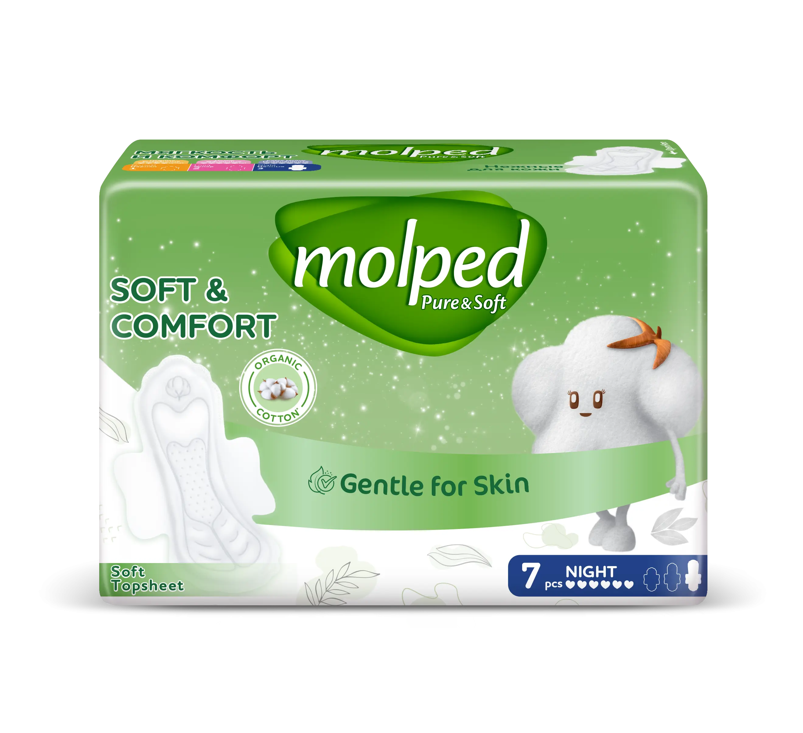 Женские ультратонкие гигиенические прокладки с крылышками Molped Pure Soft super. Не ароматизированные. Мягкая хлопковая поверхность: Обновленный мягкий верхний слой. Дышаший верхний слой, который позволяет вашей коже чувствовать себя комфортно в течение всего дня Защита от протекания: Новая форма с защитой от протекания идеально подходит для вашего белья. Новая синяя защитная зона немедленно впитывает влагу. Максимальная сухость в течение всего дня Идеальное крепление: Новые широкие крылышки прочно закрепляют прокладку на вашем белье. Максимальная уверенность благодаря уникальной форме, которая подходит вашему телу.