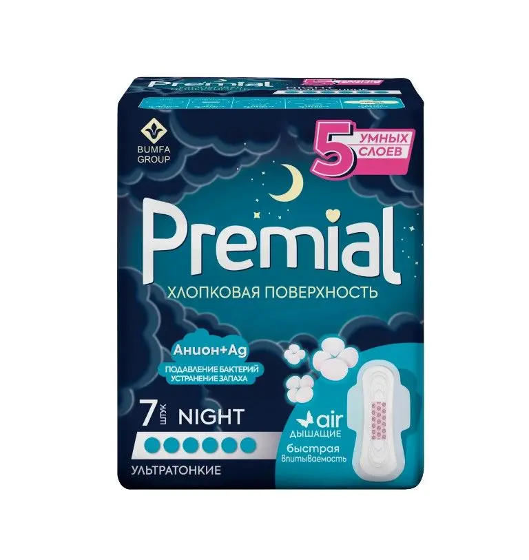 Premial прокладки женские гигиенические с крылышками night wings хлопковая поверхность 7 шт