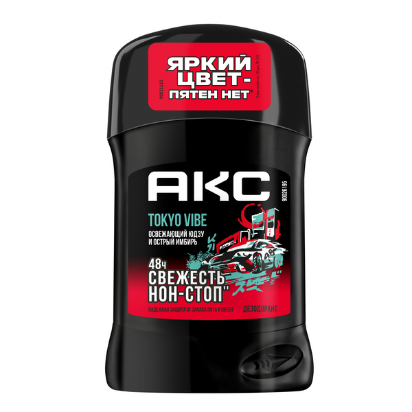 Дезодорант мужской твердый от запаха пота подмышек Акс Tokyo Vibe разработан на основе ультрасильной* антибактериальной технологии против запаха пота. Он обеспечивает 48 часов" свежести нон-стоп и надежную защиту от пятен'''. Быстро впитывается, не оставляя ощущения липкости' и подходит для ежедневного применения. Дезодорант мужской стик имеет стойкий парфюмированный аромат освежающего юдзу и острого имбиря. Удобный формат флакона в виде карандаша обеспечивает экономичный расход средства. *В портфеле бренда Акс. '10-дневный потребительский тест, 300 респондентов, Россия, 2024 г. "48ч тест оценки уровня неприятного запаха, 2010. '''Обусловленных наличием солей алюминия.