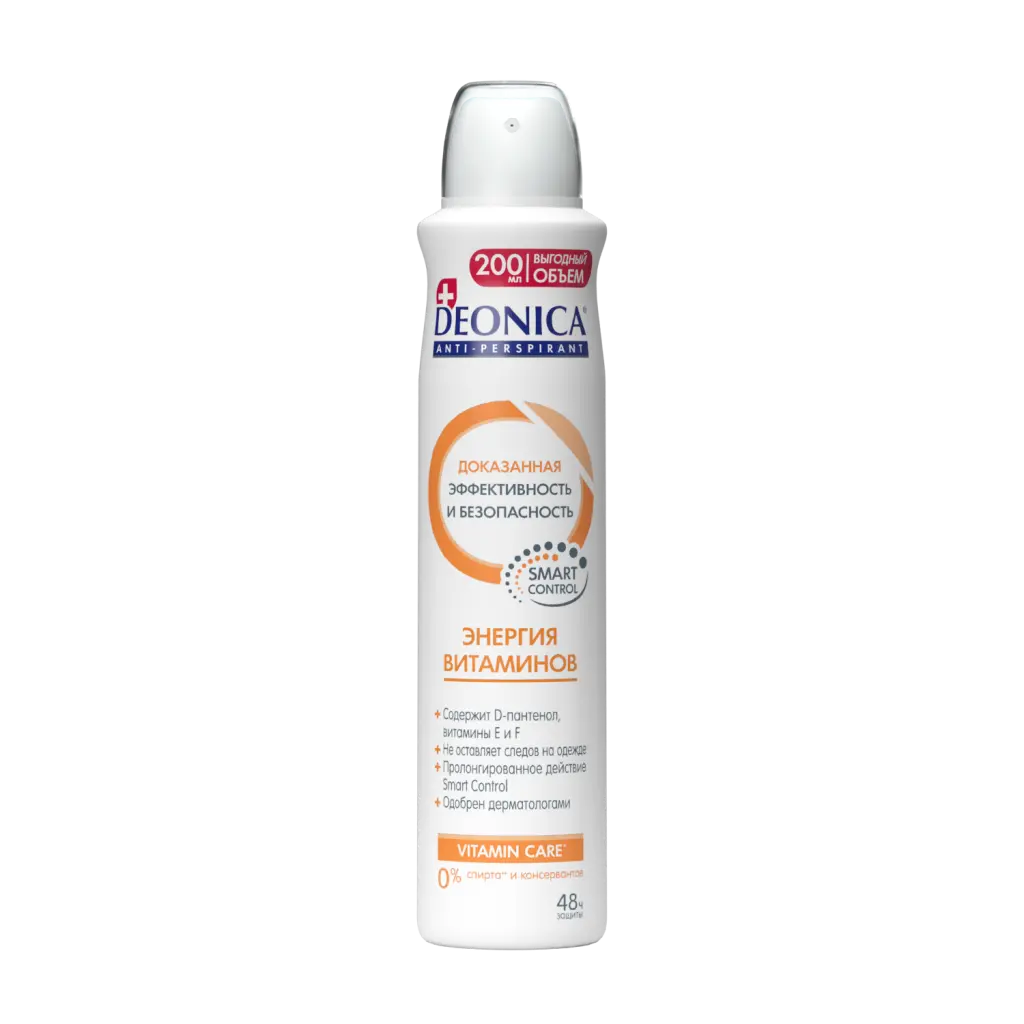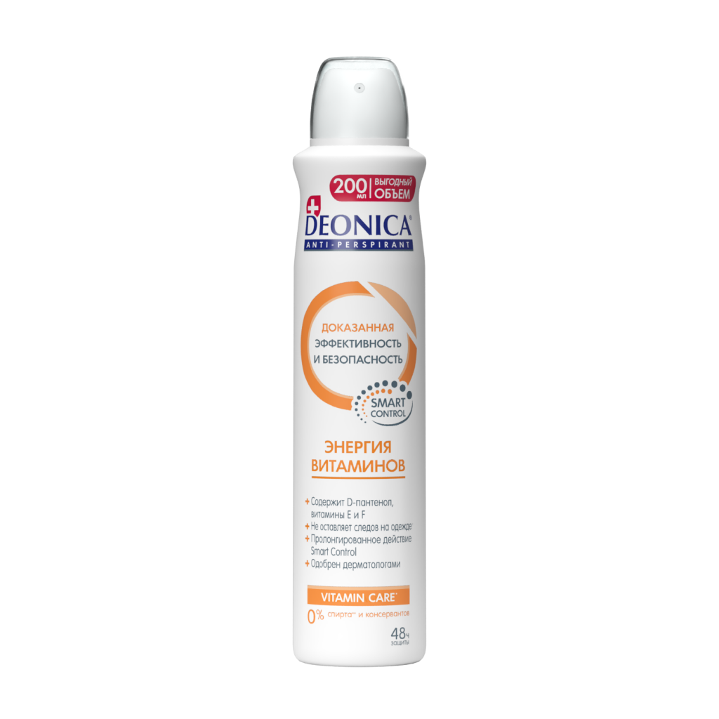 Уникальный антиперспирант Deonica "Энергия витаминов" благодаря специальной формуле с комплексом витаминов F, E и D-пантенолом способствует увлажнению и восстановлению липидного барьера кожи, обеспечивая надежную защиту и свежесть на 48 часов.
