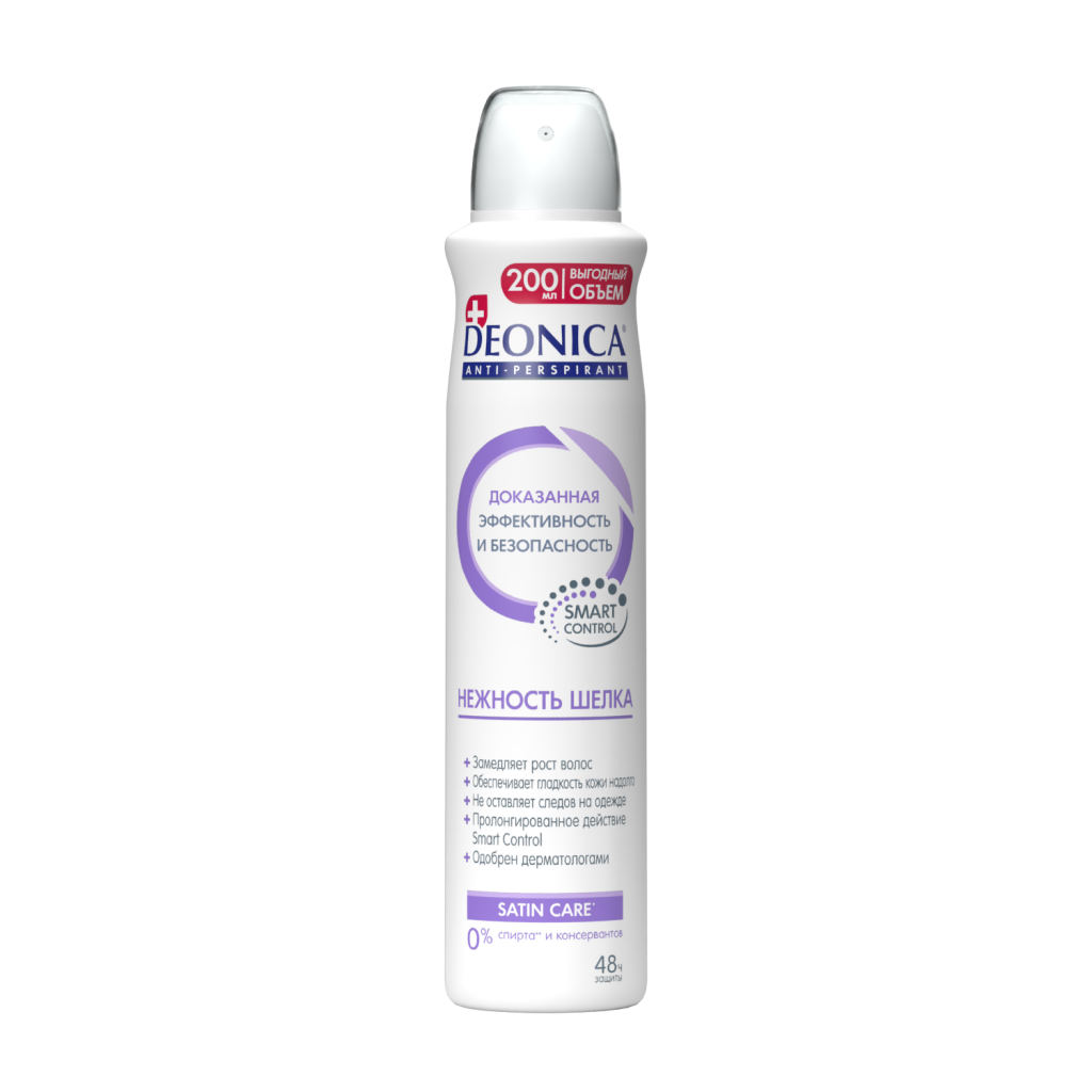 Уникальный антиперспирант Deonica ""Нежность шелка"" благодаря входящему в состав натуральному экстракту замедляет рост нежелательных волос и обеспечивает надежную защиту и свежесть на 48 часов.