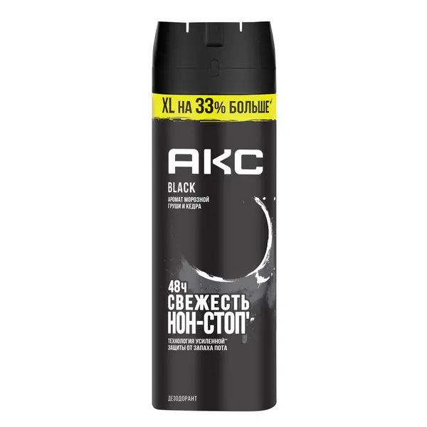 Освежающий мужской дезодорант Акс BLACK создан специально для крутых парней, которым нужна полная уверенность в своем образе и безукоризненно стильный парфюм. Аэрозольный мужской дезодорант спрей из смелой линейки создан для тех, кто не боится стоять на своем, готов следовать за мечтой и привык действовать! Дезодорант Акс мужской не оставляет следов и пятен на одежде. Дезодорант парфюмированный Акс BLACK обеспечивает желанную свежесть коже подмышек. Эффективная формула спрея Акс 2в1 включает в себя два основных элемента защиты. Это надежная защита от запаха пота на 48 часов* и топовый** аромат. Парфюмерная композиция средства раскрывается сочными нотами спелой груши, освежающего арбуза и пряного бергамота. В сердце аромата царят цветочные нотки водной лилии и фрезии, а шлейф парфюма составлен из древесных акцентов. Морозная груша и кедр — это утонченный и благородный запах, который станет изысканным дополнением к твоей коллекции парфюмированных средств для личной гигиены. Состав продукта обогащен ультрасильной'' антибактериальной технологией против запаха пота, в составе которой один из самых сильных консервантов, синтезируемый из различных зерновых культур. Она оказывает антибактериальный эффект, защищая от бактерий, вызывающих неприятный запах при потливости. Парфюмированный дезодорант Акс не блокирует потовые железы.