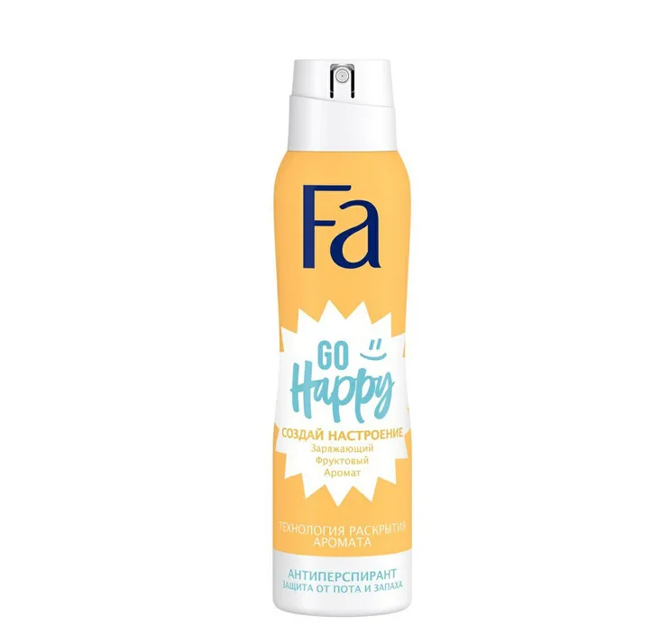 Fa Создай настроение Дезодорант спрей Go Happy 150мл. Fa Go Happy – женский антиперспирант, чья основная задача – защита от пота и запаха. Средство обеспечивает защиту до 48 часов. Антиперспирант дает ощущение длительной свежести и активирует аромат, когда это особенно необходимо. С технологией против пятен