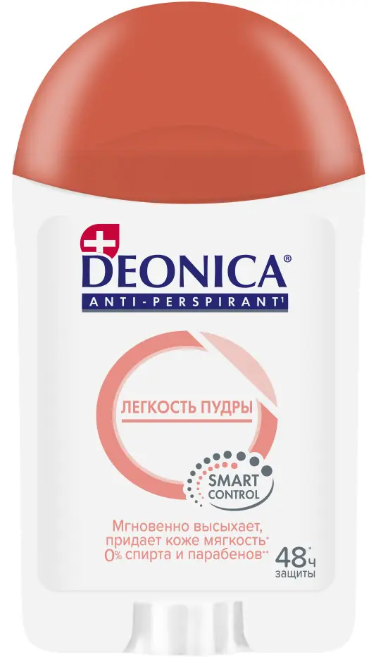 Антиперпирант-стик DEONICA ЛЕГКОСТЬ ПУДРЫ благодаря специальной формуле мгновенно высыхает, не оставляя ощущения липкости и обеспечивает надежнуюзащиту от пота и запаха на 48 часов. + Мгновенно высыхает, без ощущения липкости + Технология Smart Control с активными капсулами свежести пролонгирует действие антиперспиранта + Не оставляет следов на одежде 0% спирта и парабенов