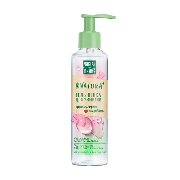 Natura - НАТУРА – это новая философия красоты бренда Чистая Линия. Природа совершенна. Зачем усложнять? Попробуйте Гель-пенку для умывания 2в1 Чистая Линия Natura - НАТУРА с organic шиповником для естественного сияния и ровного тона. Гель-пенка деликатно очищает кожу от загрязнений и избытка себума без сухости. Прекрасно удаляет макияж. Не содержит: парабены, спирт. Главный действующий ингредиент - organic шиповник: богат витаминами и антиоксидантами, обладает тонизирующими и увлажняющими свойствами, делает кожу сияющей и повышает её упругость. Подходит для всех типов кожи, даже для чувствительной.