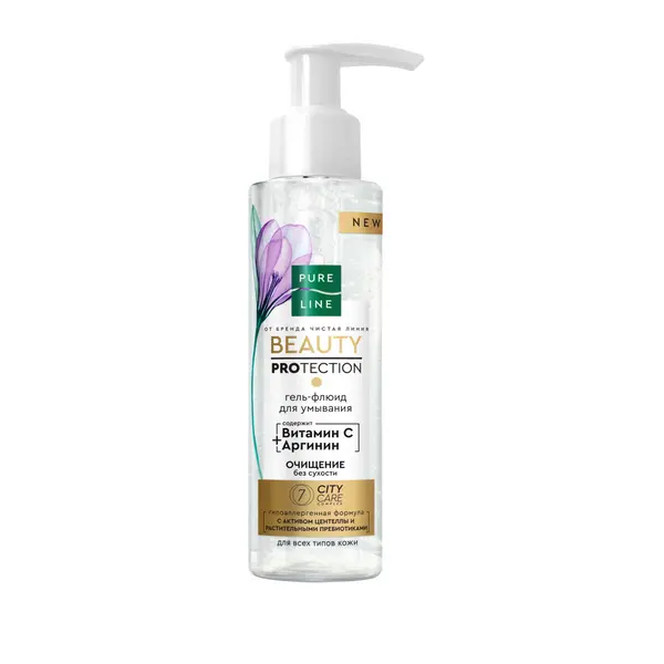 Встречайте новый уровень комфорта вашей кожи' вместе с гипоаллергенным гелем-флюидом для умывания Pure Line от бренда Чистая Линия. • Нежная пена бережно очищает без ощущения сухости. • 7 City Care Complex – 7 СИТИ КЕА комплекс с активом центеллы азиатской и растительными пребиотиками защищает от воздействия загрязнений окружающей среды и обеспечивает 7 преображающих эффектов: сияющая кожа, меньше признаков раздражения, баланс микробиома, комфорт, дополнительное увлажнение, восстановление. • Витамин С и аргинин устраняют тусклость и поддерживают естественный баланс увлажненности кожи. Имеет родственный коже рН. Подходит для ежедневного применения, в том числе для чувствительной кожи. Одобрен дерматологами. Чистая Линия не тестирует продукты на животных и имеет аккредитацию международной организации PETA. После того как используете гель-флюид, отправьте флакон в контейнер для пластика или вторсырья. Он пригоден для переработки.