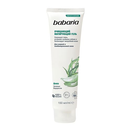 Очищающий матирующий гель для лица Babaria. Средство эффективно очищает, ухаживает за эпидермисом. Сокращает поры, устраняет излишки себума, балансирует микробиом кожи. В состав входят полезные компоненты. Экстракт алоэ вера интенсивно увлажняет, препятствует снижению синтеза коллагена и эластина, обладает противовоспалительным и восстанавливающим действием.Гель предназначен для жирной, комбинированной и склонной к появлению несовершенств кожи. На 91% состоит из натуральных ингредиентов.