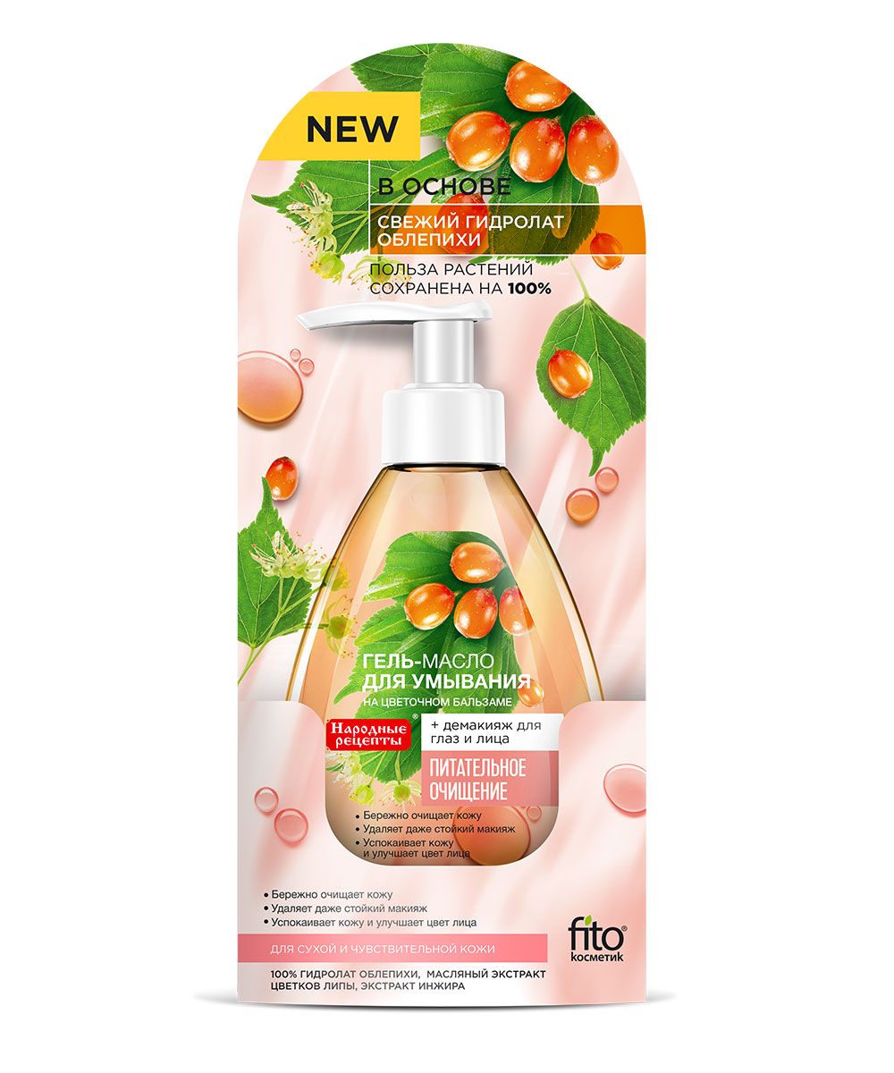 Гель-масло для умывания на цветочном бальзаме «Народные рецепты» идеально подходит для очищения кожи склонной к сухости. Благодаря особой текстуре гель-масло легко удаляет загрязнения и макияж, сохраняя гидролипидный баланс кожи. 100% гидролат облепихи и масляный экстракт цветков липы успокаивают и заживляют кожу, питают ее во время очищения. Экстракт инжира эффективно борется с сухостью и мелкими несовершенствами. С каждым применением кожа приобретает гладкость и сияние.