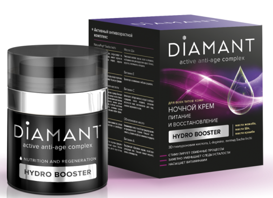Ночное время - это идеальный период для отдыха и восстановления кожи. Мышцы лица расслабляются, клеточный обмен становится интенсивнее, кожа более восприимчива к активным компонентам, содержащимся в креме. Именно потому в это время происходит глубокая коррекция возрастных признаков. Многофункциональный крем DIAMANT разработан специально для ночного ухода. Он содержит антивозрастной комплекс, который стимулирует обменные процессы, снимает усталость и напряжение кожи, накопленные в течение дня. Он содержит 10 активных компонентов, которые способствуют интенсивному питанию и омоложению кожи, улучшают ее эластичность, увеличивают плотность дермы и повышают упругость. Нежная бархатистая текстура крема быстро впитывается и не оставляет жирной или липкой пленки на лице. Активный антивозрастной комплекс: