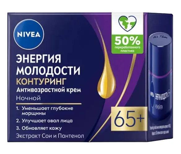 Ночной крем «Энергия Молодости» Контуринг 65+ от NIVEA заметно уменьшает морщины и стимулирует процесс обновления кожи в ночное время. Крем для лица содержит экстракт сои, масло жожоба и пантенол для интенсивного увлажнения кожи.