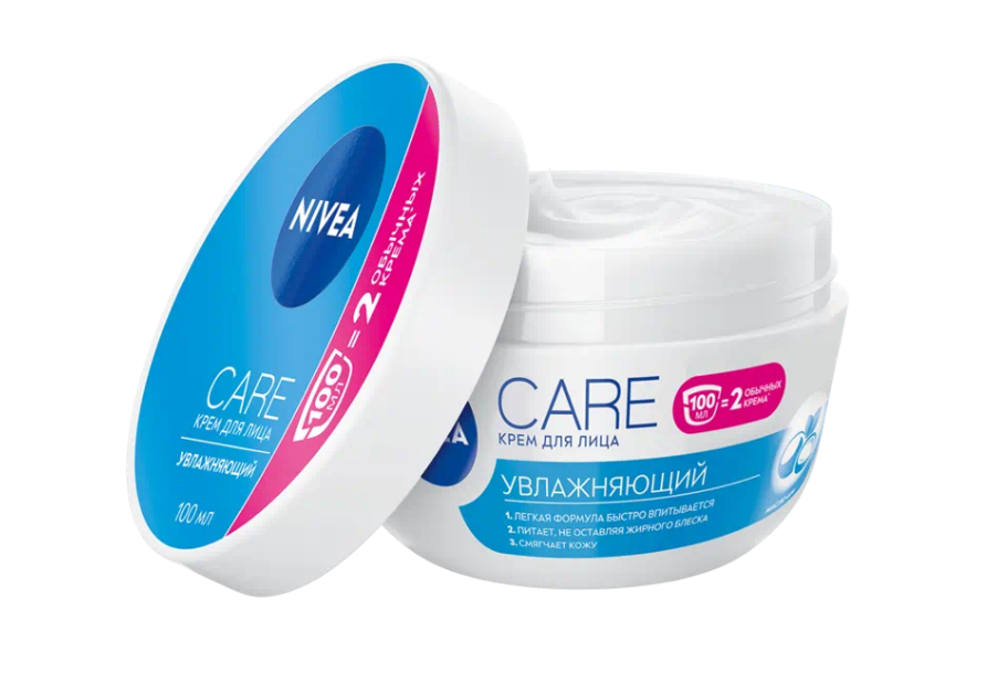 Увлажняющий крем Care для всех типов кожи от NIVEA с маслом дерева ши увлажняет на 24+ часа без ощущения липкости и жирного блеска на коже. Инновационая формула подготавливает кожу к нанесению макияжа, смягчая и разглаживая ее. Кожа выглядит заметно более здоровой и сияющей. Крем быстро впитывается благодаря легкой текстуре.
