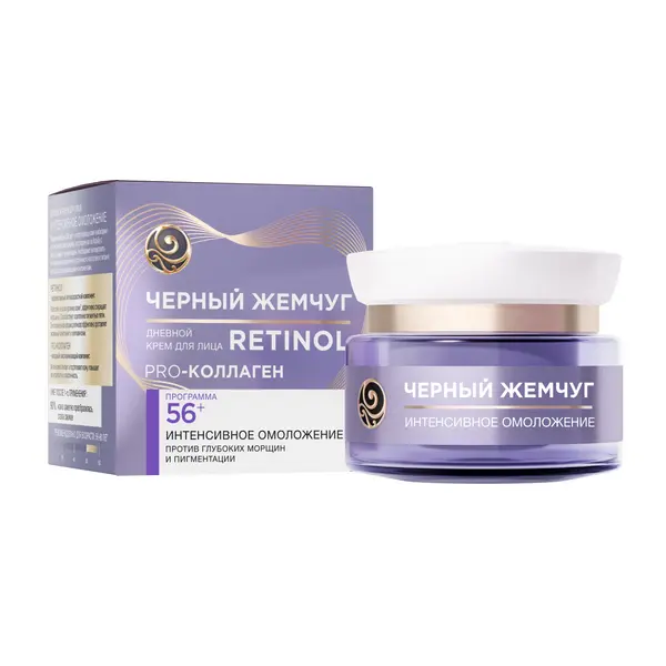 Черный Жемчуг дневной крем для лица Retinol+ PRO-коллаген Программа 56+ направлен на интенсивное омоложение, борьбу с глубокими морщинами и пигментацией. Эффект интенсивного омоложения обусловлен действием активных компонентов крема (масло ши, липосомы с витаминами А, Е и аминокислотами, экстракт водорослей ундария), нацеленных на улучшение метаболизма в коже. Синергетическое действие основной формулы крема и ингредиентов направлено на улучшение упругости, тонуса лица и соответственно омоложения кожи в целом. Тон лица выглядит более ровным благодаря содержанию в составе нитрида бора и оптических микросфер. Борьба с возрастными изменениями, в первую очередь, с морщинами и снижением упругости кожи включает повторную активацию генов, которые содержат коды для синтеза, созревания и объединения эластиновых и коллагеновых волокон, а также гиалуроновой кислоты для их повторного объединения во внеклеточные матрицы. Активный ингредиент крема – экстракт водорослей ундария (Matrigenics), запускает естественные механизмы в коже и через свои сигнальные молекулы активизирует работу основных клеток эпидермиса (кератиноцитов) и дермы (фибробластов).