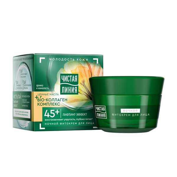 Уверены ли вы, что ваша кожа получает все необходимые питательные вещества? Ведь в зрелом возрасте именно питание и увлажнение кожи — главные помощники в борьбе за молодость и красоту. С учетом особых потребностей зрелой кожи эксперты Чистой линии разработали специальную линейку средств от 45 лет. Активные натуральные компоненты, входящие в состав средств, эффективно борются с морщинами, выравнивают цвет лица и наполняют кожу энергией и сиянием. В состав кремов линейки входят активные натуральные компоненты, созданные самой природой: арника, жимолость и комплекс фито-протеинов. Кремы Чистая Линия обогащены комплексом Фитоколлаген из ростков и семян пшеницы. Уже с первого применения проникая в кожу, комплекс Фитоколлаген наполняет и разглаживает ее. Уже через 16 дней восстанавливает контуры лица. Ночной крем с Фитоколлаген-комплексом, арникой и жимолостью Фито-линия от 45 лет эффективно насыщает влагой и питает кожу в ночное время. Активные компоненты Фитоколлаген-комплекса способствуют омоложению кожи: кожа разглаживается и наполняется энергией, цвет лица выглядит свежим, контуры шеи и лица становятся более четкими. Результат: Мгновенно: разглаживает мелкие морщины и подтягивает кожу за 16 дней выраженный лифтинг-эффект ,заметно меньше морщин, кожа интенсивно увлажнена, утром следы усталости исчезают