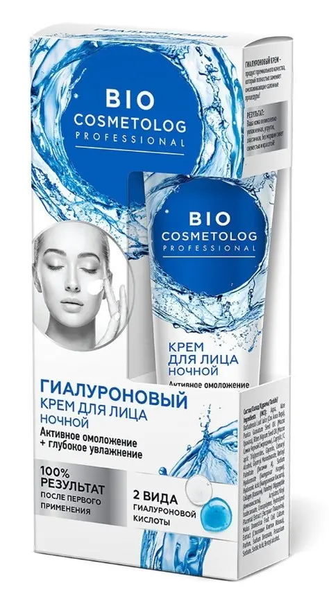 Крем для лица гиалуроновый с эффектом профессиональной биоревитализации интенсивно увлажняет и восстанавливает молодость кожи во время сна. Активная формула крема с 2 видами гиалуроновой кислоты, пептидами и коллагеном запускает процессы омоложения на клеточном уровне, ускоряет клеточное обновление, разглаживает морщины, выравнивает тон и текстуру кожи. Экстракт плаценты и стволовые клетки яблока повышают тургор кожи, обеспечивают пролонгированный эффект лифтинга, натуральные масла граната и черной смородины глубоко питают и смягчают кожу, витамин А обладает мощным омолаживающим эффектом. Ежедневное применение крема полностью заменяет профессиональную процедуру биоревитализации кожи.