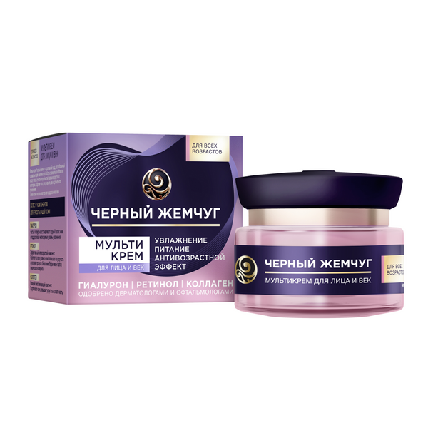 Мультикрем для лица и век Черный Жемчуг против морщин — это современный адаптивный уход, разработанный экспертами бренда специально для восстановления упругости и комплексной заботы о коже лица и области вокруг глаз. Он разработан с учетом потребности кожи разных возрастов и подходит как для дневного, так и для ночного ухода. В состав мультикрема входит более 17 компонентов для красоты кожи. Среди них: гиалурон; ретинол; коллаген; масло сладкого миндаля; масло камелии японской; масло семян подсолнечника; глицин и бетаин. Чистый гиалурон восстанавливает водный баланс кожи и поддерживает необходимый уровень увлажнения. Ретинол — эффективный антивозрастной компонент, который работает на всех уровнях кожи* и ускоряет процесс ее обновления. Коллаген подтягивает кожу, повышает ее упругость и эластичность. Мультикрем активно воздействует на мимические морщинки, разглаживая их. Мультикрем Черный Жемчуг для восстановления упругости увлажняет и питает кожу, обеспечивая комплексный уход как дневной и ночной крем для лица. Антивозрастной крем с ретинолом подходит для кожи вокруг век, обеспечивая лифтинг-эффект. Мультикрем имеет более 11 доказанных эффектов, которые помогают сохранить молодость и активно бороться с признаками увядания кожи.