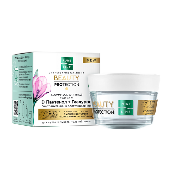 Активируйте естественные механизмы защиты кожи на новом уровне комфорта' с Pure Line от бренда Чистая Линия! Гипоаллергенный крем-мусс разработан специально для сухой и чувствительной кожи. Ухаживающая текстура отлично распределяется и впитывается, не оставляя следов. Ультрапитательная формула' содержит специально отобранные активные компоненты и эффективно воздействует на кожу уже после первого применения!* Вы заметите: меньше сухости и признаков раздражения кожи, шелушение устранено, кожа более мягкая и гладкая, более упругая и увлажненная. • D-пантенол сохраняет упругость и эластичность кожи, устраняет сухость, смягчает и восстанавливает. • Гиалуроновая кислота интенсивно увлажняет, сокращает трансэпидермальную потерю влаги. • Комплекс 7 CITY CARE 100% натурального происхождения с активом центеллы азиатской и растительными пребиотиками защищает от воздействия загрязнений окружающей среды и обеспечивает 7 преображающих эффектов: сияющая кожа, меньше признаков раздражения, баланс микробиома, сохранение упругости, комфорт, дополнительное увлажнение, восстановление.