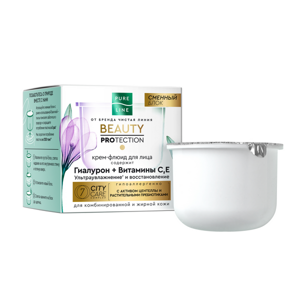Откройте новый уровень комфорта' вашей кожи и активируйте естественные механизмы ее защиты с Pure Line от бренда Чистая Линия! Гипоаллергенный крем-флюид разработан с учетом всех потребностей жирной и комбинированной кожи. Невесомая тающая текстура легко впитывается и не оставляет жирной пленки. В составе продукта: • Гиалуроновая кислота интенсивно увлажняет, сокращает трансэпидермальную потерю влаги; • Витамины С и Е оказывают антиоксидантное действие, помогают устранить раздражение и шелушение; • Комплекс 7 CITY CARE 100% натурального происхождения с активом центеллы азиатской и растительными пребиотиками защищает от воздействия загрязнений окружающей среды и обеспечивает 7 преображающих эффектов: сияющая кожа, меньше признаков раздражения, баланс микробиома, сохранение упругости, комфорт, дополнительное увлажнение, восстановление. Уже после первого применения вы заметите результат*: ощущение комфорта без раздражения, кожа более упругая и увлажненная, она выглядит отдохнувшей и свежей, меньше жирного блеска. Продукт представлен в формате рефилл. Позаботьтесь о природе вместе с нами! Ведь это так просто!