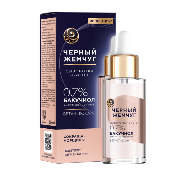 Для ежедневного комплексного ухода за зрелой кожей лица воспользуйтесь омолаживающей инновационной* сывороткой-бустер Черный Жемчуг. Она разработана экспертами бренда совместно с косметик-эстетистами. Средство подходит для женщин и мужчин с разными типами кожи, включая чувствительную. Преимущества: • Стимулирует синтез коллагена, повышая эластичность и упругость кожи; • Заметно сокращает морщины; • Улучшает текстуру и выравнивает тон кожи; • Глубоко** проникает в кожу, осветляя участки гиперпигментации; • Интенсивно увлажняет; • Защищает кожу, смягчая последствия отрицательного воздействия ультрафиолета; • Мгновенно впитывается без ощущения липкости. Активные действующие компоненты: Бакучиол ампул-концентрат в высокой концентрации 0,7% стимулирует синтез собственного коллагена, повышает эластичность и упругость кожи. Бета-глюкан интенсивно насыщает кожу влагой и защищает от воздействия негативных факторов окружающей среды. Почувствуйте усиленный эффект при использовании программы ухода: 1. Обновляющая пилинг-маска для лица 2. Крем-эксперт для век 3. Крем для лица 45+ SPF 30 Свойства омолаживающей сыворотки-бустера подтверждены в ходе потребительского тестирования***.