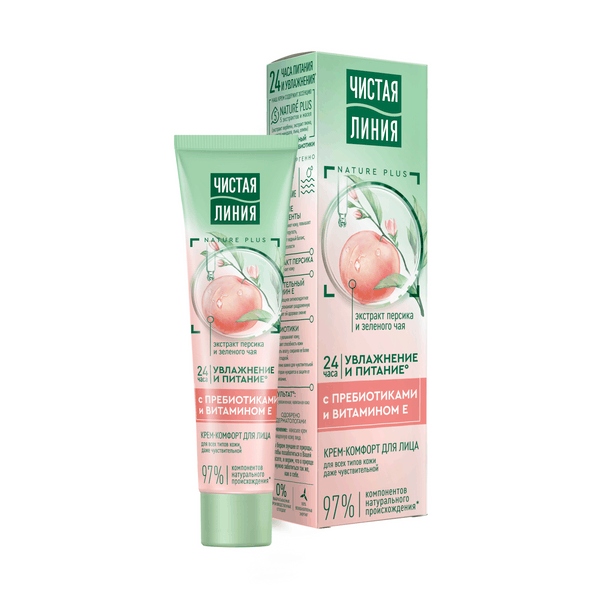 Крем-комфорт для лица увлажняющий и питательный Чистая Линия – это эффективное уходовое средство для всех типов кожи, в том числе для чувствительной. Чистая Линия крем для лица с экстрактами персика и зеленого чая на 97% состоит из компонентов натурального происхождения*. Гипоаллергенный крем для лица содержит эссенцию 5 экстрактов и масел NATURE PLUS (экстракты вербены и пиона, масла льна, миндаля и оливы). Дневной крем для лица с витамином Е и пребиотиками обеспечивает коже интенсивное увлажнение и питание в течение 24 часов**. Крем для лица гипоаллергенный с экстрактами персика и зеленого чая питает, смягчает и увлажняет кожу. Легкий увлажняющий крем для лица повышает эластичность и упругость кожи, избавляет ее от тусклости, оказывает мощное антиоксидантное действие. Увлажняющий крем для лица успокаивает раздраженную кожу, придает ей здоровое сияние. Питательный крем для лица Чистая Линия с витамином Е и пребиотиками мгновенно увлажняет кожу, восстанавливает водный баланс. Успокаивающий крем для лица увеличивает способность кожи удерживать влагу, сохраняя ее более мягкой и гладкой. Это особенно важно для чувствительной кожи, которая нуждается в дополнительном увлажнении и защите от обезвоживания.