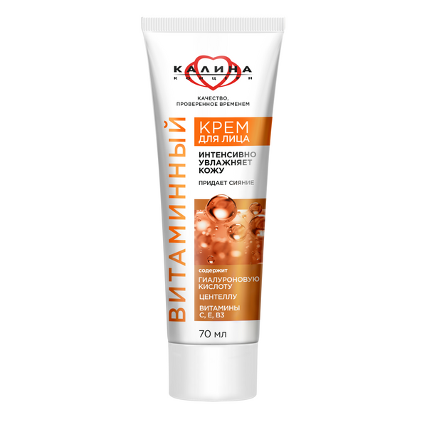 Красота кожи лица невозможна без ежедневного качественного домашнего ухода, соответствующего ее типу и потребностям. Для увлажнения и сияния попробуйте Витаминный крем концерна КАЛИНА! Эффективные компоненты в его составе оказывают комплексное воздействие, направленное на восстановление, интенсивное увлажнение и сияние кожи: • Так, витамин С – мощный антиоксидант, поддерживает ее сопротивляемость неблагоприятным факторам внешней среды, способствует процессам обновления. • Витамин Е способствует восстановлению эластичности и защищает кожу от преждевременного старения. • Витамин В3 увлажняет, укрепляет защитный барьер кожи, стимулирует процессы восстановления. • Гиалуроновая кислота интенсивно увлажняет, поддерживает водный баланс кожи, разглаживает мелкие морщинки. • Экстракт центеллы восстанавливает, уменьшает шелушение, повышает упругость и эластичность кожи, тонизирует.