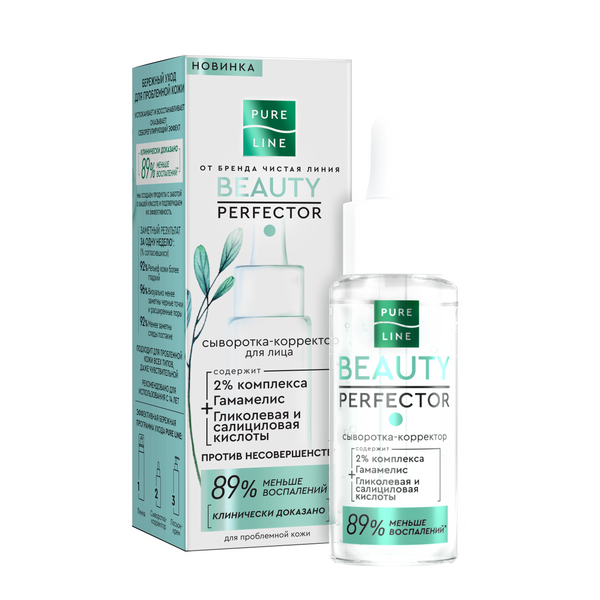 Позвольте своей коже сиять здоровьем и красотой, борьбу с несовершенствами возьмет на себя программа ухода за проблемной кожей Pure Line Beauty Perfector от бренда Чистая Линия. Клинически доказано: 89% – меньше воспалений*. Сыворотка-корректор ЭФФЕКТИВНО И БЕРЕЖНО УХАЖИВАЕТ ЗА КОЖЕЙ, действуя сразу в нескольких направлениях: • Успокаивает; • Восстанавливает; • Оказывает себорегулирующий эффект. АКТИВНЫЕ ИНГРЕДИЕНТЫ: • Экстракт гамамелиса снижает раздражение и покраснение, сокращает жирный блеск. • Гликолевая и салициловая кислоты борются с воспалениями и сокращают следы постакне. Свойства продукта подтверждены в ходе потребительского тестирования. Заметный результат за одну неделю': 92% респондентов отметили, что рельеф кожи стал более гладким; 96% – визуально менее заметны черные точки и расширенные поры; 92% – менее заметны следы постакне.