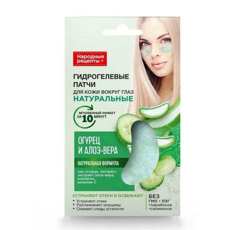Народные Рецепты натуральные гидрогелевые патчи для кожи вокруг глаз огурец и алоэ 7 гр