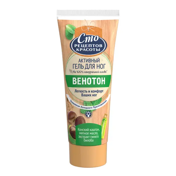 Работа на ногах, узкая одежда, ношение каблуков, повышенная температура воздуха – все это способствует отечности и усталости ног. Попробуйте активный гель для ног Венотон от бренда СТО РЕЦЕПТОВ КРАСОТЫ, и ваши ножки вновь ощутят комфорт и легкость. Специально подобранные компоненты обладают активным действием для достижения выраженного результата. Технология холодного приготовления позволяет сохранить все полезные свойства активных компонентов геля. • Конский каштан способствует укреплению стенок кровеносных сосудов, улучшает обменные процессы в клетках кожи, тонизирует и снимает отечность. Обладает эффектом снятия чувства усталости, тяжести и напряжения. • Мятное масло тонизирует и восстанавливает, способствует охлаждению и приданию чувства легкости в ногах после применения. • Экстракт гинкго билоба успокаивает и тонизирует кожу, улучшает питание клеток и уменьшает отечность. Результат: легкость и комфорт ваших ног! Продукт выпускается в тубе объемом 70 мл, его удобно брать с собой и пользоваться дома по мере необходимости. Нанесите Венотон на стопы и голени (снизу вверх) массирующими движениями до полного впитывания.