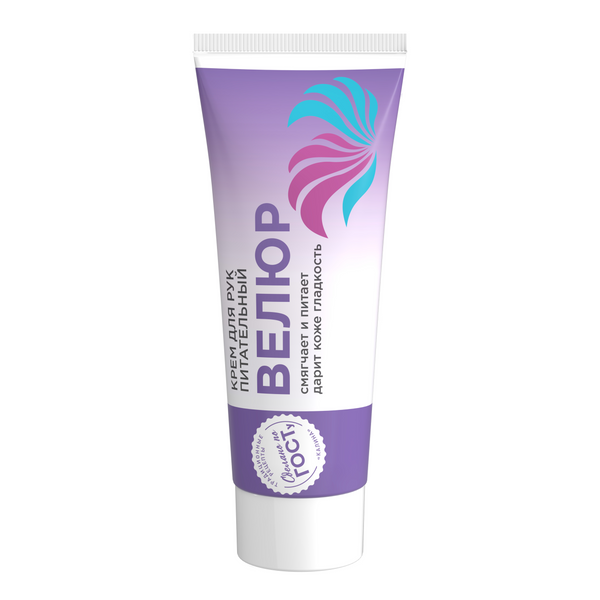 Для себя и своих близких мы выбираем лучшее. То, что прошло проверку временем. Серия косметических кремов СДЕЛАНО ПО ГОСТу разработана с учетом традиций и современных стандартов качества. Крем для рук Велюр выпускается вот уже более 30 лет. Это выбор покупателей, которые ценят качество по приятной цене. Продукт отличает неизменное качество. В составе крема активные ингредиенты, эффективно снимающие шелушение и сухость кожи рук. • Так, экстракт ромашки в сочетании с активными компонентами крема придает коже рук гладкость, успокаивает, помогает снять раздражение. • Глицерин смягчает и увлажняет. • Витамин F участвует в липидном обмене кожи, увлажняет, обеспечивая ее эластичность. • Масло подсолнечника оказывает смягчающее и увлажняющее действие на сухую кожу. Для наилучшего результата наносите питательный крем перед выходом на улицу, после каждого контакта с водой, а также на ночь. Крем выпускается в пластиковой тубе объемом 70 мл. Рекомендуем приобрести сразу несколько кремов и пользоваться дома, брать с собой на работу, в машину, чтобы иметь возможность наносить по мере необходимости. Крем Велюр отлично впитывается без ощущения жирности и создает на поверхности кожи вуаль, которая препятствует чрезмерной потере влаги. При постоянном использовании крема Велюр – ваши ручки мягкие и нежные!