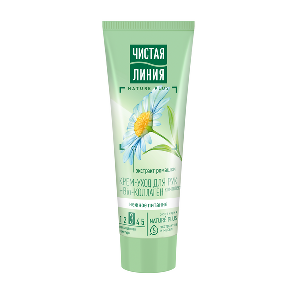 Встречайте крем для рук от Чистой Линии с усиленной формулой1 и в обновленном дизайне! Для полноценного ухода за руками попробуйте крем Нежное питание Ромашка, разработанный экспертами бренда Чистая Линия. Он обеспечивает питание кожи 24 часа2. Крем эффективно и надолго устраняет сухость кожи. Активные натуральные компоненты восстанавливают, глубоко3 питают кожу рук, делая ее вновь нежной и бархатистой. Продукт имеет насыщенную текстуру и на 97% состоит из компонентов натурального происхождения*. Эссенция из пяти взаимодополняющих экстрактов и масел NATURE PLUS (экстракт вербены, экстракт пиона, масла миндаля, льна, оливы) восстанавливает и питает кожу. - Экстракт вербены восстанавливает баланс увлажненности и тонизирует. - Экстракт пиона и льняное масло успокаивают и смягчают. - Масло миндаля содержит жирные кислоты, витамины Е и F, питает и выравнивает поверхность кожи. - Ферментированное оливковое масло богато природными антиоксидантами, питает и помогает предотвратить преждевременное старение кожи. - Bio-коллаген защищает кожу от чрезмерной потери влаги, разглаживает и смягчает. - Экстракт ромашки успокаивает и увлажняет кожу рук.