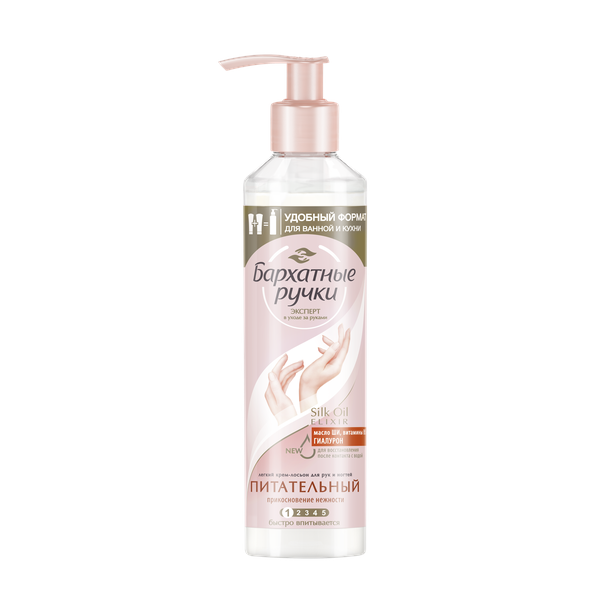 Бренд Бархатные Ручки представляет крем-лосьон для рук и ногтей Прикосновение нежности. Каждый день жесткая вода и очищающие средства сушат кожу рук, ухудшая ее состояние на 30% [1]. Новая формула крем-лосьона с добавлением гиалурона интенсивно питает кожу рук, способствует восстановлению после каждого контакта с водой и устраняет 5 проблем, связанных с сухостью кожи: стянутость, шелушение, шероховатость, потеря влаги, снижение упругости. А легкая тающая текстура крем-лосьона впитывается быстро, не оставляя жирной пленки. Формула Silk Oil Elixir – Силк Ойл Эликсир содержит микромасла и протеины шелка и усиливает действие лосьона. Крем-лосьон имеет легкую текстуру с эффективно действующими компонентами, обеспечивает необходимое питание и увлажнение кожи, способствует укреплению ногтей и смягчению кутикулы. Удобная упаковка с дозатором идеально подойдет для использования на кухне, в ванной или в офисе. ГИАЛУРОН сохраняет влагу в коже, устраняя сухость и стянутость.