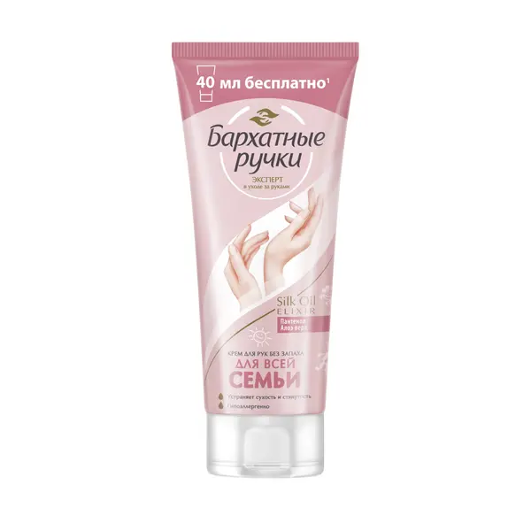 Бренд Бархатные Ручки представляет крем для рук Для меня и моей семьи. Гипоаллергенная формула без запаха разработана специально для бережного ухода за чувствительной кожей рук и ежедневного ухода. Крем увлажняет, питает и смягчает кожу, уменьшая шелушение и признаки раздражения. Благодаря легкой текстуре, крем быстро впитывается, а отсутствие выраженного запаха и красителей обеспечивает комфортное использование для каждого члена семьи. Формула Silk Oil Elixir усиливает действие крема. Микромасла восстанавливают клетки кожи и в комплексе с протеинами шелка делают ее мягкой и нежной. Крем подходит для детской кожи: -Защита и нежный уход за детскими ладошками -Питание и увлажнение для маминых ручек -Устранение сухости без запаха и липкой пленки для папиных рук Формула Silk Oil Elexir представляет собой комплекс, состоящий из микромасел и протеинов шелка.
