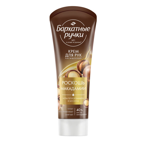 Доверьте ежедневный уход новинке от бренда №1 в уходе за руками° – крему Бархатные ручки Роскошь макадамии. Продукт имеет насыщенную текстуру, при этом отлично наносится и впитывается. В составе крема 40% масла макадамии', которое в сочетании с другими активными ингредиентами эффективно питает, смягчает и восстанавливает. Наносите крем для рук Роскошь макадамии каждый день и наслаждайтесь эффектом и роскошным гурманским ароматом. Пирамида стартует нотами бергамота, переходящими в аккорды жасмина и персика. База аромата – ваниль и мускус. Такое сочетание ассоциируется с удовольствием и умиротворением. Свойства продукта подтверждены в ходе потребительского тестирования*. В составе крема нет спирта. Подходит даже для очень сухой кожи рук. Можно использовать в любое время года, но за счет плотной насыщенной текстуры и активных компонентов в действующей концентрации, крем особенно эффективен в холодное время года, а также для ухода за сухой кожей рук.