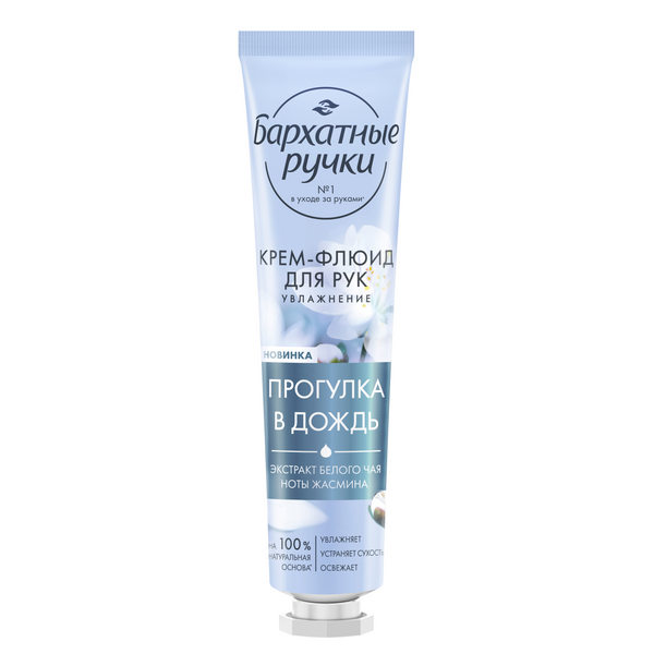 Заметили, что кожа рук сухая? Бархатные ручки разработали новый парфюмированный крем-флюид Увлажнение Прогулка в дождь. Формула на 100% натуральной основе с экстрактом белого чая увлажняет, устраняет сухость и освежает. Свежий аромат крема раскрывается фруктами, далее следуют зеленые нотки и аккорд жасмина, в завершении – мускусные и древесные ноты. Результат: увлажненные и ухоженные ручки. Свойства подтверждены потребительским тестированием: 100 респондентов, min 91% согласившихся, РФ, 2023.