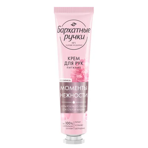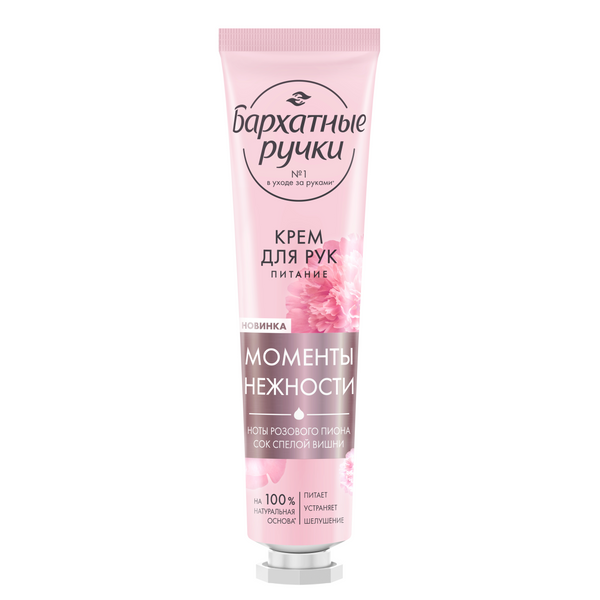 Подарите своим ручкам качественный уход, а себе – удовольствие от аромата только что сорванных цветов вместе с новинкой от бренда Бархатные ручки – кремом Питание Моменты нежности. Формула на 100% натуральной основе с соком вишни эффективно питает, устраняет стянутость и шелушение. Не содержит спирта. Подходит для ежедневного использования. Результат: кожа рук ухоженная и мягкая.