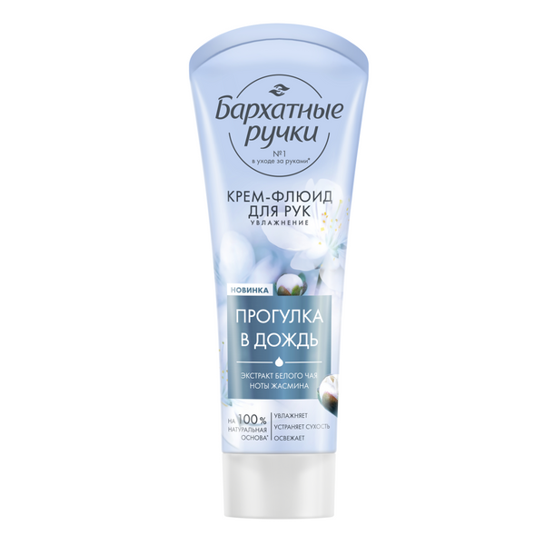 Заметили, что кожа рук сухая? Бархатные ручки разработали новый парфюмированный крем-флюид Увлажнение Прогулка в дождь. Формула на 100% натуральной основе с экстрактом белого чая увлажняет, устраняет сухость и освежает. Свежий аромат крема раскрывается фруктами, далее следуют зеленые нотки и аккорд жасмина, в завершении – мускусные и древесные ноты. Результат: увлажненные и ухоженные ручки. Свойства подтверждены потребительским тестированием: 100 респондентов, min 91% согласившихся, РФ, 2023.