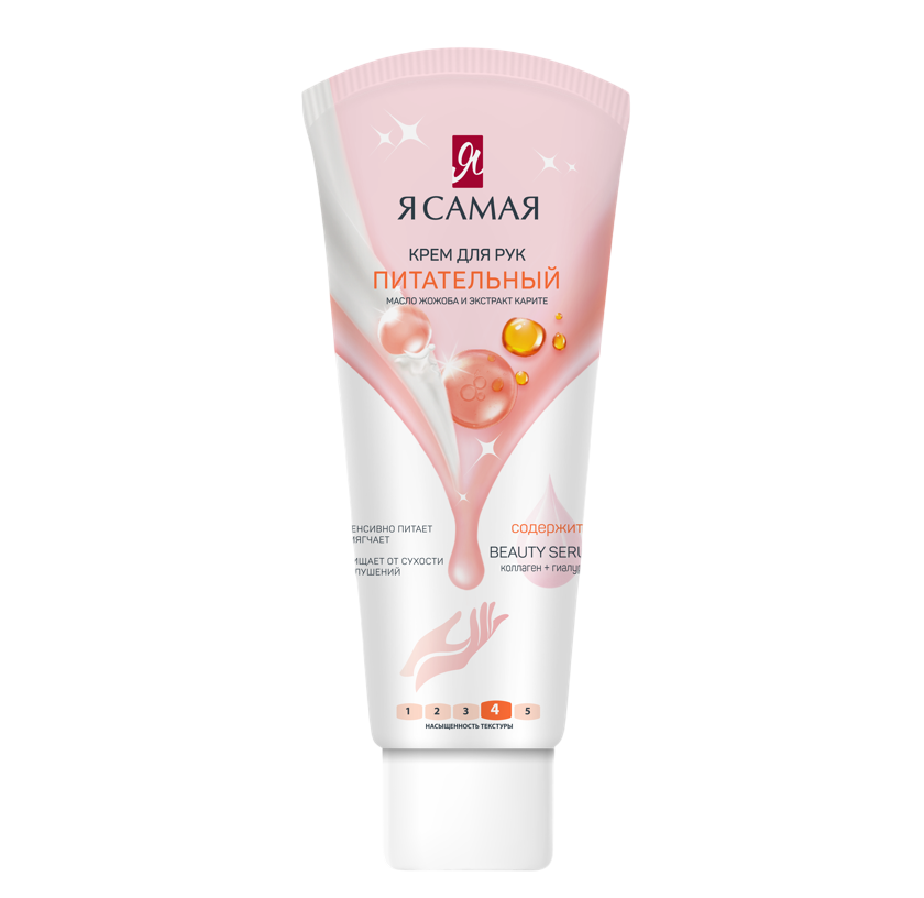 Эксперты бренда Я САМАЯ создали НОВУЮ ФОРМУЛУ в уходе за руками, содержащую сыворотку BEAUTY SERUM на основе гилуроновой кислоты и коллагена, для деликтного ежедневного ухода за кожей рук. Масло жожоба обеспечивает защитный слой, идеально увлажняя и питая кожу рук. Экстракт карите способствует увлажнению, смгячению и разглаживанию кожи.