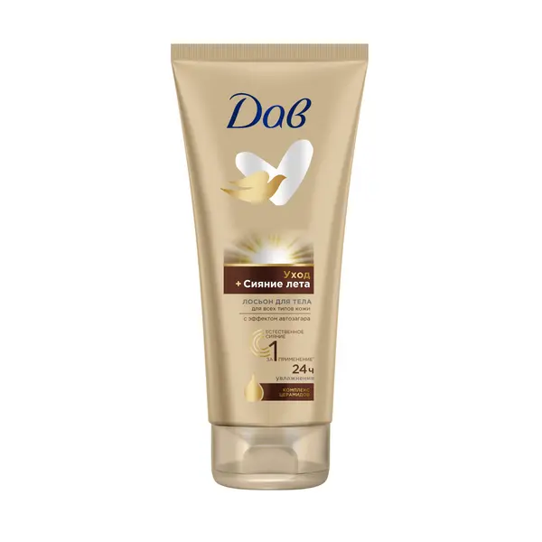 Лосьон Dove Сияние лета – это естественное сияние вашей кожи всего за одно применение*! Лосьон постепенно придаёт нежный оттенок загара, подчеркивая естественный цвет вашей кожи. Компоненты нашей уникальной' формулы Ceramide Restoring Serum способствуют выработке церамидов, укрепляют кожный барьер, помогая ему удерживать больше влаги. Результат: ваша кожа приобретает не только естественный эффект загара уже после первого применения, но и дополнительное увлажнение на 24 часа для придания коже мягкости''.