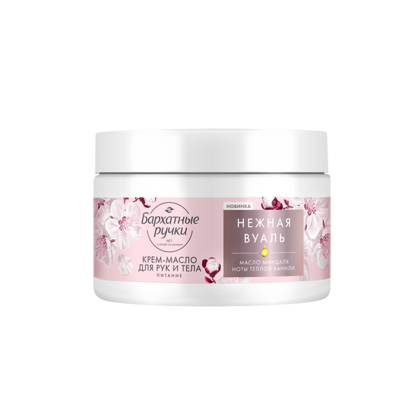 Подарите себе спа-процедуру дома с новинкой от бренда Бархатные ручки, – крем-маслом для рук и тела Питание Нежная вуаль. Формула на 100% натуральной основе обогащена маслом миндаля, насыщенная текстура эффективно питает и придает коже мягкость. Аромат крем-масла открывается фруктовыми нотами, которые поддерживают ландыш и миндаль, база аромата – кремовая ваниль и мускус. *Свойства подтверждены потребительским тестированием: 100 респондентов, min 84% согласившихся, РФ, 2023.