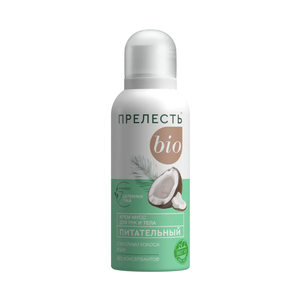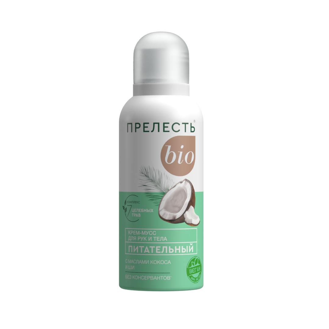 Крем-мусс Прелесть БИО имеет воздушную текстуру, легко и приятно распределяется по коже, быстро впитывается и не оставляет неприятной липкости или пленки. Он создает ощущение комфорта и увлажнения, делая кожу более мягкой и гладкой. ∙ Питает кожу, помогает удерживать влагу в коже, делая ее более увлажненной и мягкой. ∙ Питательный крем создает защитный барьер на поверхности кожи, который помогает защитить ее от вредных воздействий окружающей среды. ∙ Идеально подходит не только для кожи рук, но и для тела. ∙ Без консервантов, минеральных масел, силиконов, парабенов и красителей.* Наслаждайтесь здоровой, сияющей кожей каждый день! Способ применения: перед использованием хорошо встряхнуть баллон. Держа баллон вертикально, выдавить необходимое количество крема и легкими движениями нанести до полного его впитывания на чистую кожу. Новый баллон встряхивать 20-25 с и опробовать на бумагу 2-3с. Применять крем при температуре не ниже + 10°С. Меры предосторожности: Использовать только по назначению согласно способу применения! Избегать попадания в глаза, при попадании в глаза тщательно промыть их водой! Баллон находится под давлением! Не вскрывать и не сжигать баллон даже после использования! Предохранять от воздействия прямых солнечных лучей и нагревания выше 50 °С! ОГНЕОПАСНО! Не распылять вблизи открытого огня и раскаленных предметов! Не курить! Не разбирать и не давать детям! Хранить в недоступных для детей местах! В случае возникновения аллергической реакции прекратить применение и обратиться к врачу! После использования или по окончании срока годности продукцию утилизируют как бытовой отход.