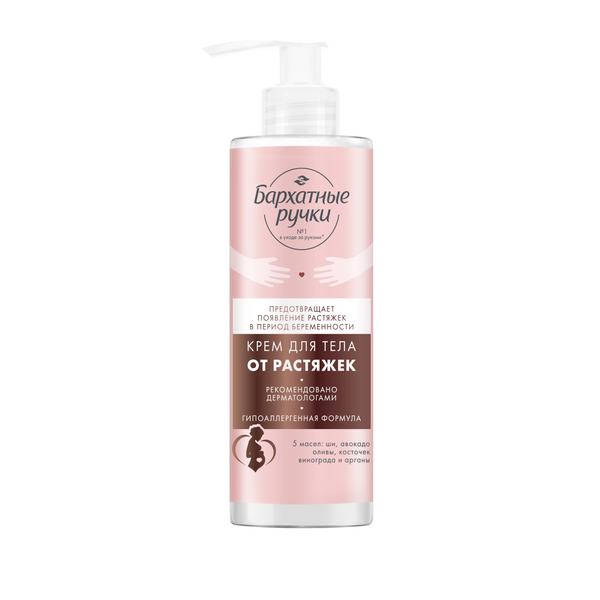 Крем от растяжек для беременных Бархатные Ручки предназначен для использования в период до беременности, во время нее и после родов. Имеет гипоаллергенную формулу с комплексом из пяти натуральных масел (ши, авокадо, оливы, косточек винограда и арганы), коллагеном, эластином и миндальным молочком. Средство от растяжек разглаживает и питает кожу, повышает ее эластичность и уменьшает видимость растяжек. Подходит для профилактики и предотвращения появления растяжек с первых дней беременности. Рекомендовано дерматологами, подходит для ежедневного применения.