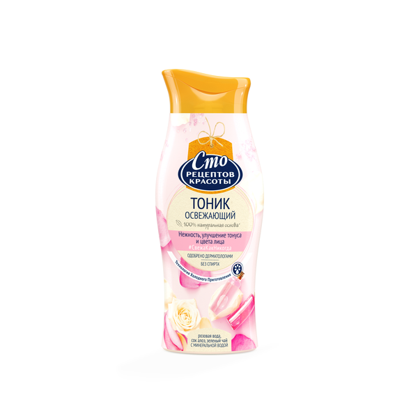 Полноценный ежедневный уход за кожей лица невозможен без качественного тонизирования кожи. Эксперты бренда Сто рецептов красоты разработали освежающий тоник для лица Увлажнение. Это настоящий superfood для кожи! Состав продукта тщательно сбалансирован и отлично подойдет для всех типов кожи.Экстракт лепестков розы восстанавливает кожу, придает сияние, питает, повышает эластичность и упругость. Сок алоэ успокаивает, увлажняет и обладает тонизирующим действием. D-пантенол смягчает и обеспечивает восстанавливающий эффект.Свойства продукта подтверждены потребительским тестированием*. Так, 98% женщин отметили, что тоник освежает, улучшает цвет лица и тонус кожи; 99% – после применения кожа гладкая и нежная.Для наилучшего результата воспользуйтесь и другими продуктами серии. Начните с умывания, далее воспользуйтесь освежающим тоником для лица Увлажнение, затем нанесите крем вокруг глаз и крем для лица по типу кожи. Такой ежедневный уход позволит бережно и качественно очистить кожу, восстановить и увлажнить ее.