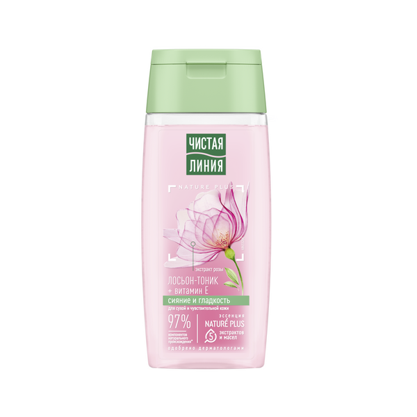 Встречайте обновленный лосьон-тоник от Чистой Линии с усиленной формулой1 и новым дизайном! Эксперты бренда Чистая Линия разработали лосьон-тоник, обогащенный экстрактом лепестков роз, с учетом особенностей сухой и чувствительной кожи. Ощутите гладкость и сияние сразу после применения продукта! В составе продукта 97% компонентов натурального происхождения*! Эссенция NATURE PLUS – это пять экстрактов и масел для ухода за кожей: - Экстракт вербены восстанавливает баланс увлажненности и тонизирует; - Экстракт пиона и льняное масло успокаивают и смягчают; - Масло миндаля содержит жирные кислоты, витамины Е и F, питает и выравнивает поверхность кожи; - Ферментированное оливковое масло питает и защищает от преждевременного старения; - Экстракт лепестков розы и витамин E успокаивают, придают коже гладкость и здоровое сияние. Свойства подтверждены результатами потребительского тестирования**: - 80% респондентов отметили, что тоник нежно освежает кожу лица; - 68% – дает ощущение максимального комфорта и свежести; - 88% – кожа выглядит отдохнувшей и свежей в течение всего дня; - 72% – цвет лица ровный сияющий. Одобрено дерматологами