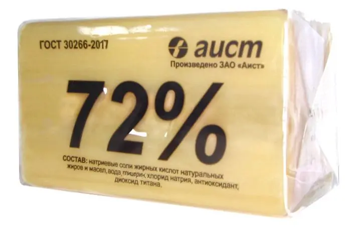 Мыло хозяйственное твёрдое 72 % представляет собой продукт, состоящий из натриевых солей жирных кислот натуральных жиров и масел (кокосового, пальмового, подсолнечного) с добавлением глицерина, пластификаторов, антиоксидантов и смягчающих веществ.