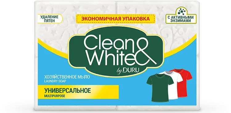 Мыло хозяйственное для стирки Clean&White обладает приятным ароматом и эффективно справляется с пятнами благодаря энзимам - веществам органического происхождения, которые обеспечивают удаление трудных загрязнений.