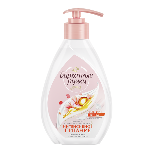 Бренд Бархатные Ручки представляет крем-мыло для рук Интенсивное питание, с которым мытье рук превратится в косметическую процедуру по уходу. Крем-мыло содержит крем Бархатные Ручки, за счет чего обеспечивает нежное очищение и питание кожи во время мытья рук. Не содержит красителей. Соответствует естественному уровню pH кожи.