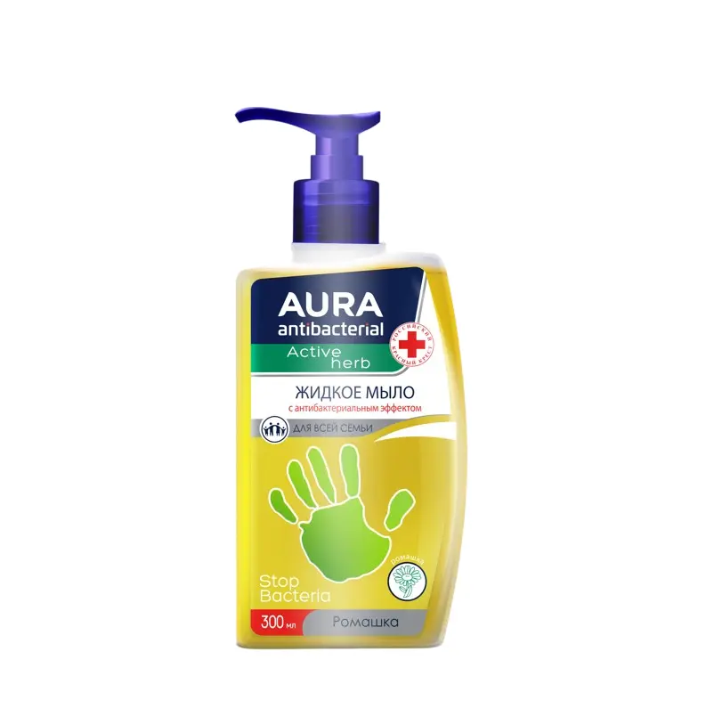 Жидкое мыло с антибактериальным эффектом AURA Active Herb с Ромашкой деликатно очищает кожу рук, обеспечивая эффективное удаление с кожи загрязнений и бактерий, сохраняя при этом естественный липидный баланс. Натуральный экстракт ромашки обладает противовоспалительным и антисептическим действием, а также устраняют раздражение и смягчают кожу.