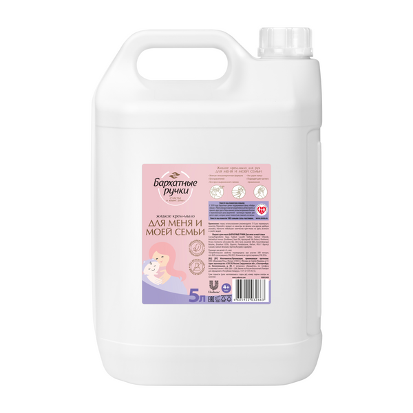 Жидкое крем-мыло для рук Для меня и моей семьи от Эксперта №1 в уходе за руками* – бренда Бархатные ручки – теперь представлено в увеличенном объеме 5 л. • Мягкая гипоаллергенная формула; • Без красителей; • С деликатным ароматом; • Не сушит кожу**; • Подходит для частого применения; • Подходит для использования всей семьей, в том числе детьми с 4-х лет. Объема 5 л хватит надолго даже при постоянном использовании, его удобно перелить во флаконы с дозатором для ванной и кухни. Отличный вариант для использования дома и в офисе.