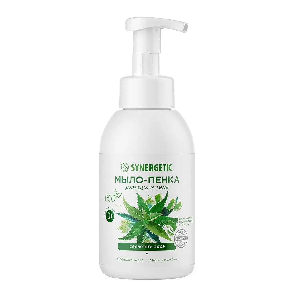 Synergetic гипоаллергенное натуральное детское мыло пенка для рук и тела свежесть алоэ 500 мл