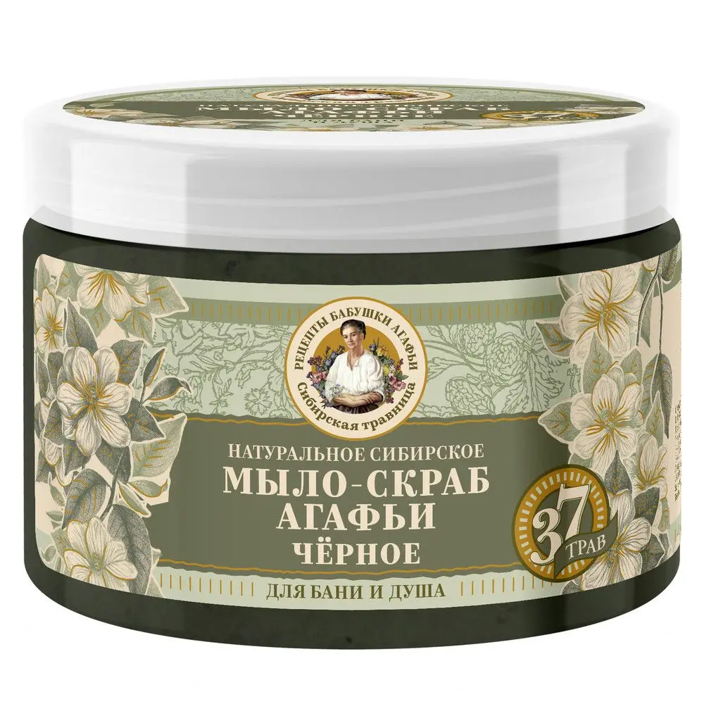 Чёрное мыло-скраб создано на основе густого мыла Агафьи по старинным рецептам. Уникальный комплекс из 37 сибирских трав в сочетании с дёгтем и берёзовой чагой питает кожу и дарит терпкий аромат. Редкие дикие растения содержат в себе феноменальное количество витаминов и полезных веществ, поэтому их экстракты незаменимы для ухода за кожей. Скорлупа кедровых орешков бережно удаляет ороговевшие клетки и усиливает проникновение трав и активных компонентов, делая кожу невероятно мягкой и бархатистой. Прекрасно подходит для бани и душа.